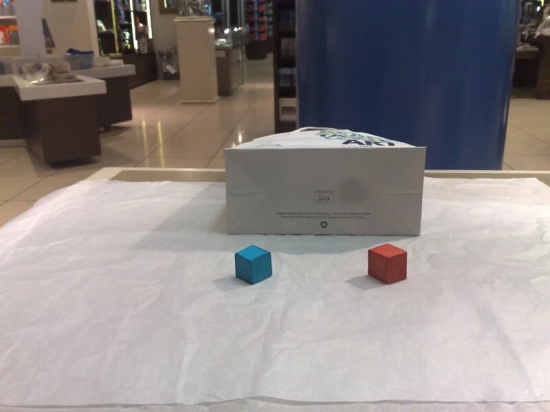 Experiment 2: Varying the size of the cubes. One large blue, one small red, positioned apart, and in depth in the space. Testing whether the eye and brain come into conflict when 3D glasses are worn and merge the cubes, forcing a floating ‘3rd’ cube (a combination of the two different sized cubes)…